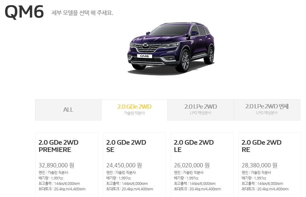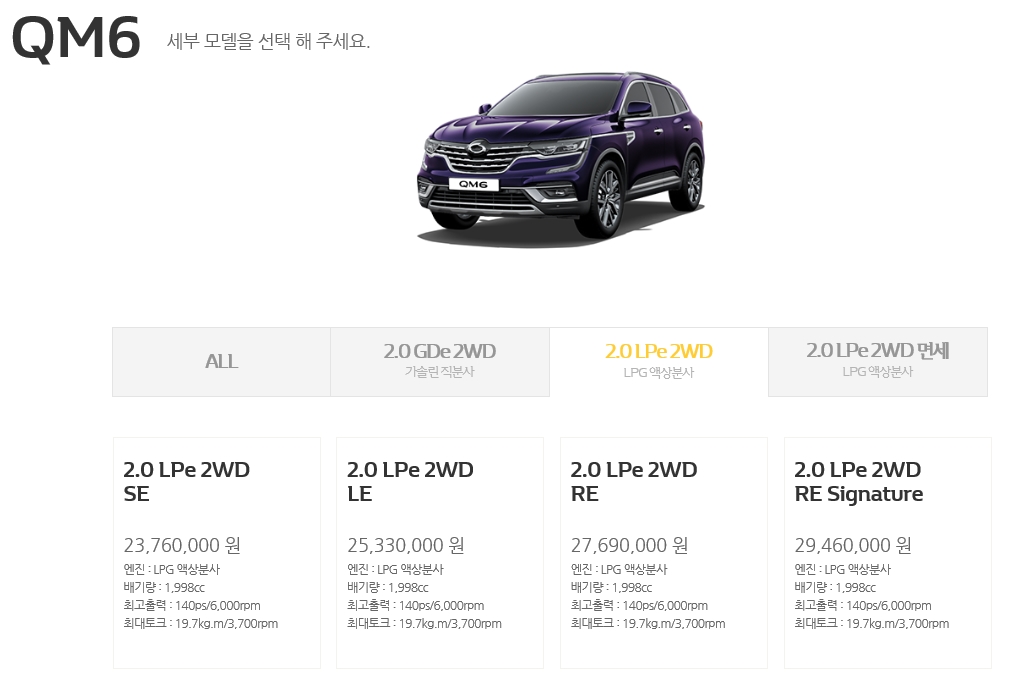 qm6 lpe 일반인 전용 차량은 약이천삼백만원부터 시작을 하며, 최고등급 re시그니쳐 약이천구백만원대 합니다.