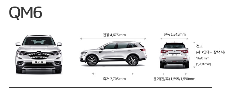qm6 크기를 잘 모르시는 분들이 있을 것같아 위에표를 보시면 전장은 4,675mm 축거는 2,705mm입니다. 전폭은 1,845mm이며 윤거 전후 1,595.1590mm입니다. 경쟁차종 기아 쏘렌토보다는 작고 스포티지보다는 큰 포지션에 위치하고 있습니다.