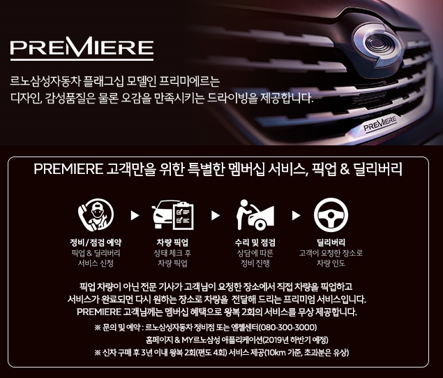 프리미에르 고객은 외관뿐만 아니라 서비스도 다르게 제공이 되는데요 정비/정검을 예약을 하면 직원이 직접 차량을 픽업하고 완료가 되면 원하는 장소로 차량을 전달해드리는 서비스로 왕복 2회의 서비스를 무상제공한다고 합니다. 이건 거의 프리미엄급에서는 하는것인데 qm6프리미에르에 시작을 하는 군요