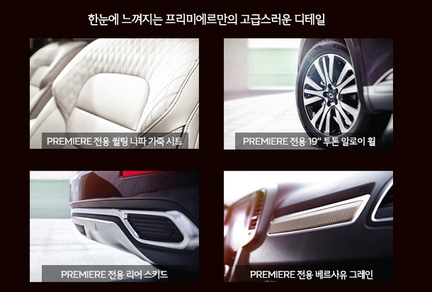 프리미에르는 가솔린 제일 상위버전인데요 다른것과 차별을 두었습니다. 보통 이런것은 전용로고도 따로 들어가는데 역시나 전용로고가 따로 들어가더군요 전용스키드,휠도 19인치 전용알로이휠, 빈티지 레드 보디컬러등이 신적용이 되었습니다.