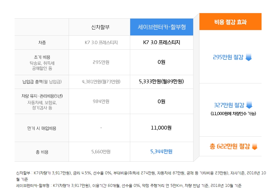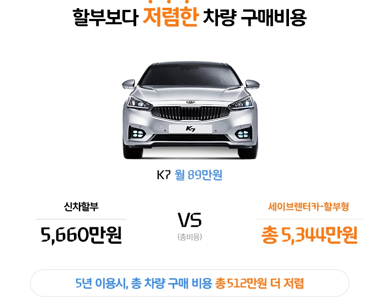 위에 표는 비교표인데요 할부로 구매를 했을때와 세이브렌터카할부형으로 구매를 했을때에 비교표입니다. 일딴 결론적으로 말씀드리면, 5년 이용시 총 512만원이 저렴하다고 하네요