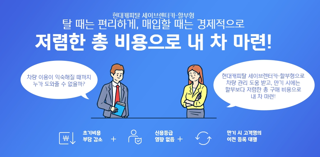 안녕하세요 현대캐피탈 자동차이용프로그램중에 세이브가 되는 세이브렌터카에 대해 알아보려고 합니다. 할부에 금융적인으로 부담스럽고 인수는 하려고 하는데 일반렌터카상품은 선호하지 않는 분들에게 좋은 상품인데요 어떤 상품인지 아래와 같이 확인을 해보시길 바랍니다.