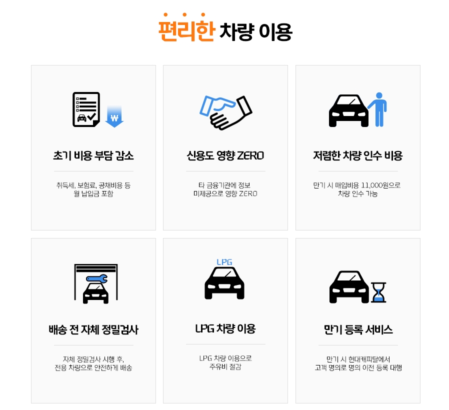 이 상품에 장점이라면, 초기비용(상황에따라납부하실수 있습니다.)이 전혀들지 않으면서 금융부분에 대한 신용등급에 영향이 없습니다. 대출로 안잡혀 있다는게 제일장점인데요 또한 차를 처음구입하는 분들에 경우 보험료가 높아서 배보다 배꼽이 큰 경우도 있는데요 이 상품에 경우 보험까지 다 들어주니 부담스럽지 않는 상품입니다.
