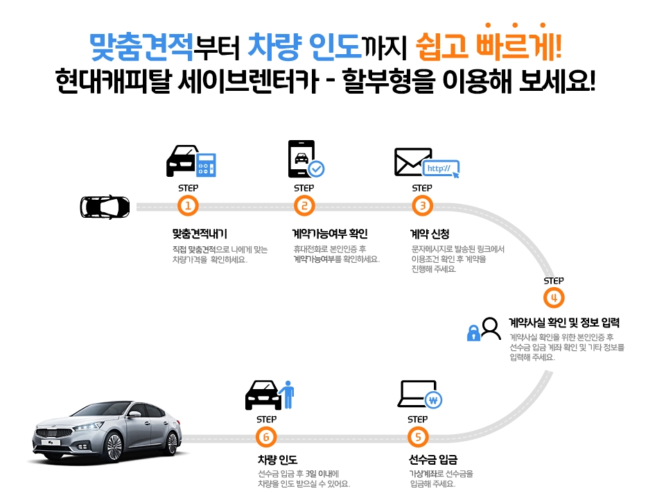 어떻게 계약을 하는지도 궁금하실텐데요 계약순서는 위와 같습니다. 계약가능여부확인>>계약신청>>계약사실 확인 및 정보입력>>선수금입금>>차량인도 입니다.