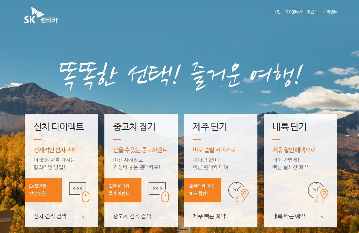 sk렌터카를 방문을 하면 위와 같은 화면이 보인다. 신차다이렉트는 신차렌트이며, 중고차장기는 월단위로 대여를 할 수 있는 프로그램이다. 내륙단기도 있고 제일 궁금한것이 제주단기일것이다. sk렌터카 최대 90%이니 많이 저렴한 편이다.