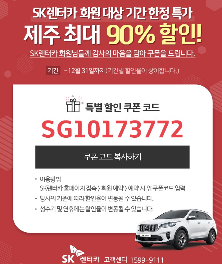 이렇게 특별할인 쿠폰코드까지 있다 위에 쿠폰코드를 이용을 하면 보다 저렴하게 이용을 할 수 있다. sk렌터카 고객센터는 1599-9111이다. 무조건 사고나면 여기로 전화를 하면 된다.