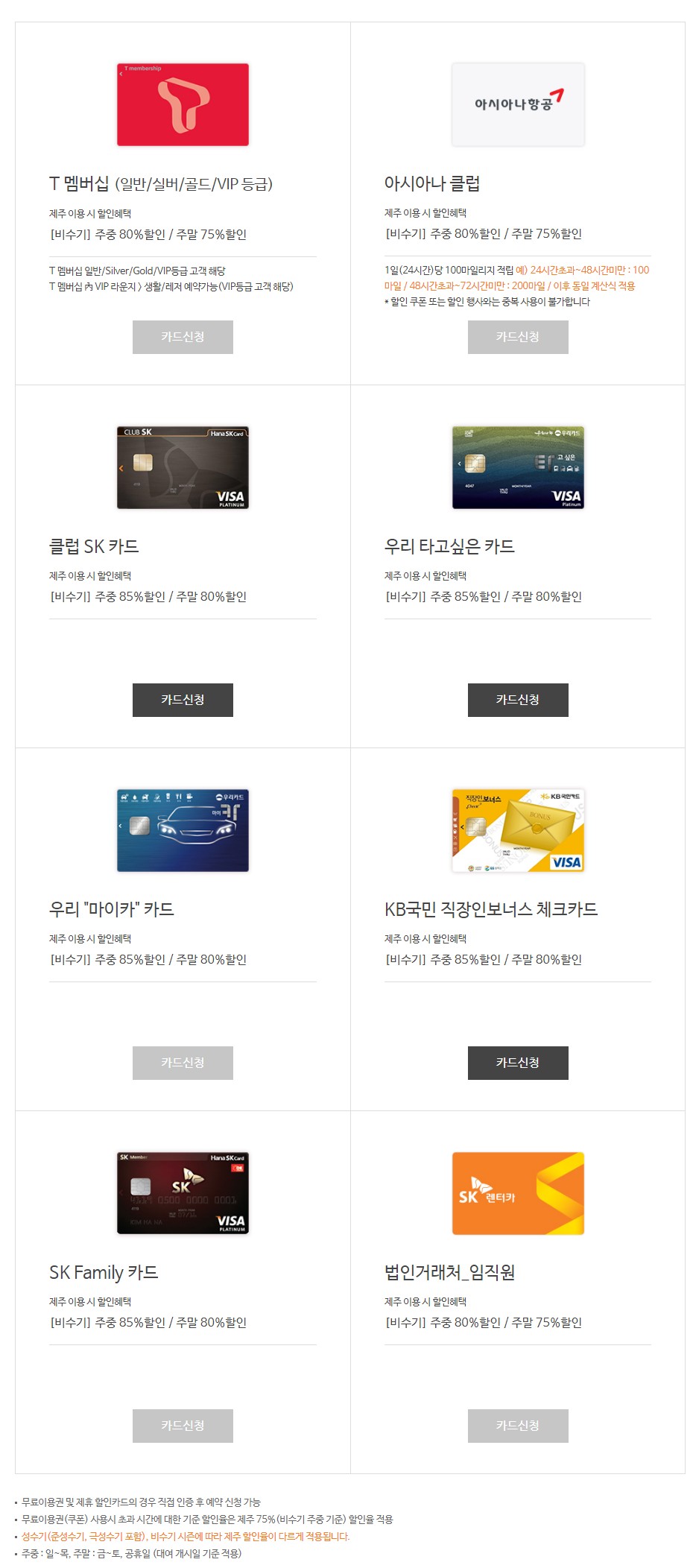 그리고 여러가지 카드 할인혜택과 법인거래처 임직원 할인등이 있다. 카드에 sk표시 되어 있는 경우도 많으니 위에 카드들을 숙지를 하고 꼭 할인을 받도록 한다. 개인적으로 추천은 t멤버쉽 할인이 제일 많이 된다. 그리고 중고나라나 당근마켓에서 돌고도는 렌터카 무료이용권도 추천한다. 좀 더 저렴하게 얻을 수 있다.