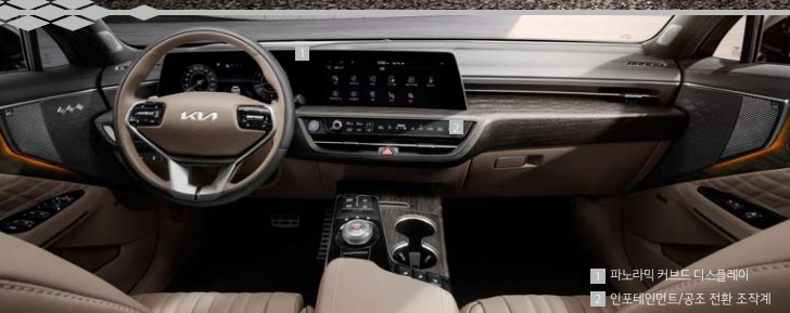 먼저 제일 눈에 띄는게 바뀐 기아 로고입니다. 보면 볼 수록 이쁘네요 그리고 12.3인치 커브드 계기판과 인포테인먼트 시스템은 부드럽게 이어지며, 시계영역을 최적화로 시야를 확보하고 1열을 감싸는 장식으로 한 것이 인상적입니다. 시트는 나파가죽 퀄팅시트로 고급스러움을 높였고 메리디안 사운드 시스템이 최초로 들어갔습니다. 센터페시아 센터 콘솔과 도어트림에는 우드그레인을 써서 더욱 고급스러움을 보여주고 금속 가죽소재를 조화를 이루면서, 세련된 이미지까지 보여줍니다. 기어 노브는 다이얼로 적용이 되었습니다.