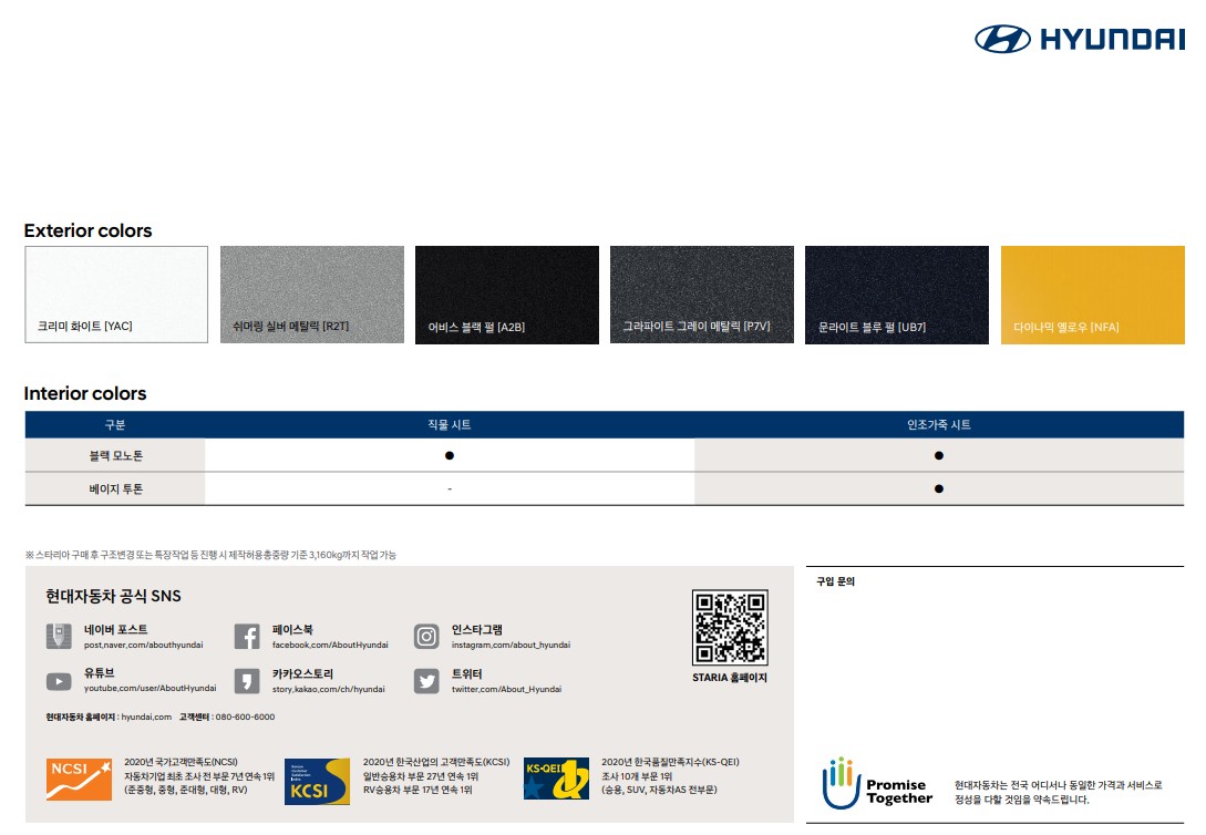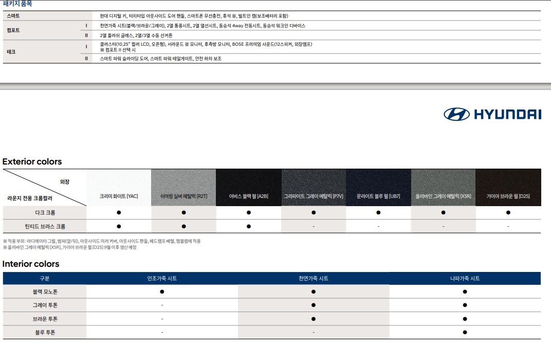 크리미 화이트 ,쉬머링 실버메탈릭 ,어비스 블랙펄 , 그라파이트 그레이 메탈릭 , 문라이트 블루 펄, 올리바인 그레이 메탈릭 ,가이아 브라운 펄