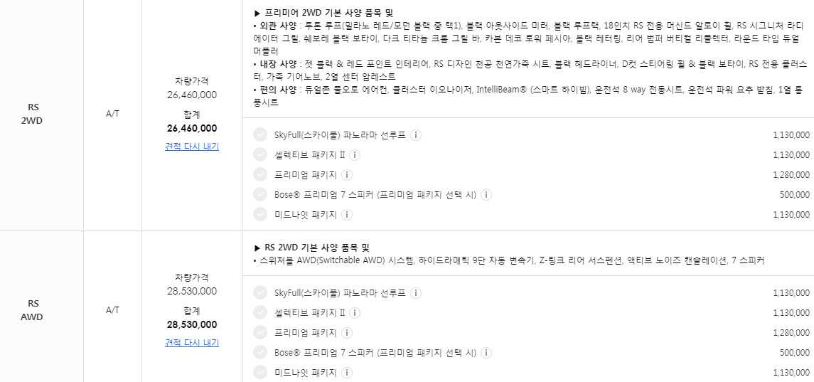 또한 LED 헤드램프와 다양한 첨단 주행 안전 시스템, 스마트폰 무선 충전 시스템 등이 포함된 셀렉티브 패키지Ⅱ와 천공 천연가죽 시트, 운전석 8 방향 모드 전동시트, 1열 통풍시트 등이 적용된 컴포트 패키지Ⅲ가 적용된다.