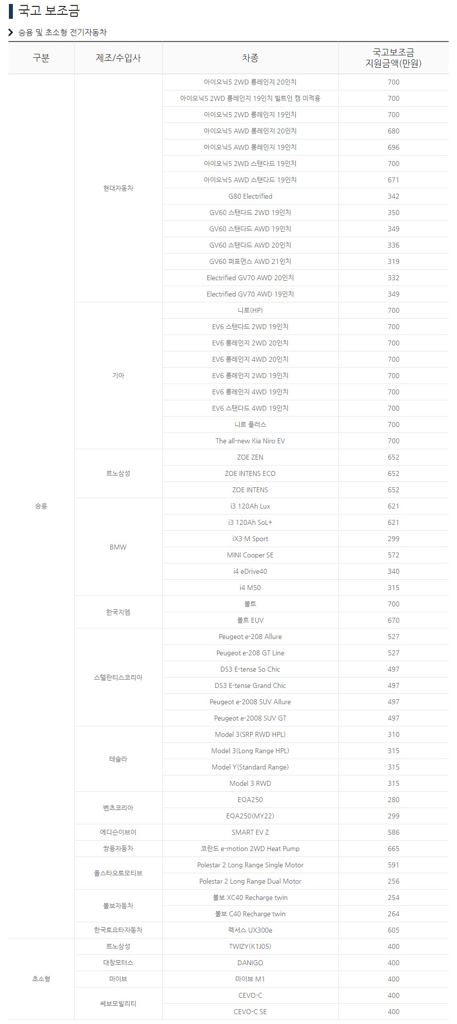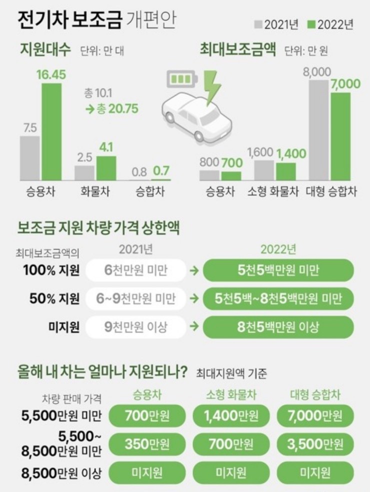 보조금 한도가 기존의 최대 800만원에서 700만원으로 100만원 깎이고, 차량가액 상한액도 6000만원에서 5500만원으로 하향됩니다. 5,500만∼8,500만 원 미만은 50% 지원, 8,500만 원 이상 차량은 미지원입니다.