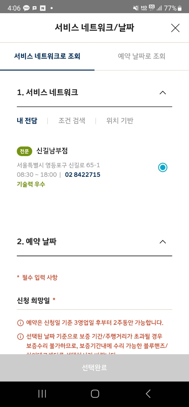 저는 주로 신길남부점을 이용하는 편인데, 예약이 쉽지 않다는 느낌을 받았습니다. 8월 말에 예약을 시도했을 때 바로 가능하지 않고 9월로 넘어가더라고요 ㅋ 항상 이렇습니다 이럴때에는 급하시거나 시간이 안맞을 때에는 곧바로 전화로 연락하시고 대략 대기시간에 얼마나 걸리는 물어본다음 직접 방문하시는 것을 권해드립니다. 예약이 그렇게 큰 의미가 없더라고요 저에 경우에는 그리고 대부분 블루핸즈 가시면 대기장소도 있기에 편히 커피한잔 드시면서 있으실 수 있습니다 그리고 팁을 하나 드리자면 가능하다면 월요일이나 금요일은 피하시고 평일 오전 오후정도로 방문하시면 됩니다 또한 각 지점의 영업시간이 다를 수 있으니 아래 홈페이지를 참고하시기 바랍니다: 링크