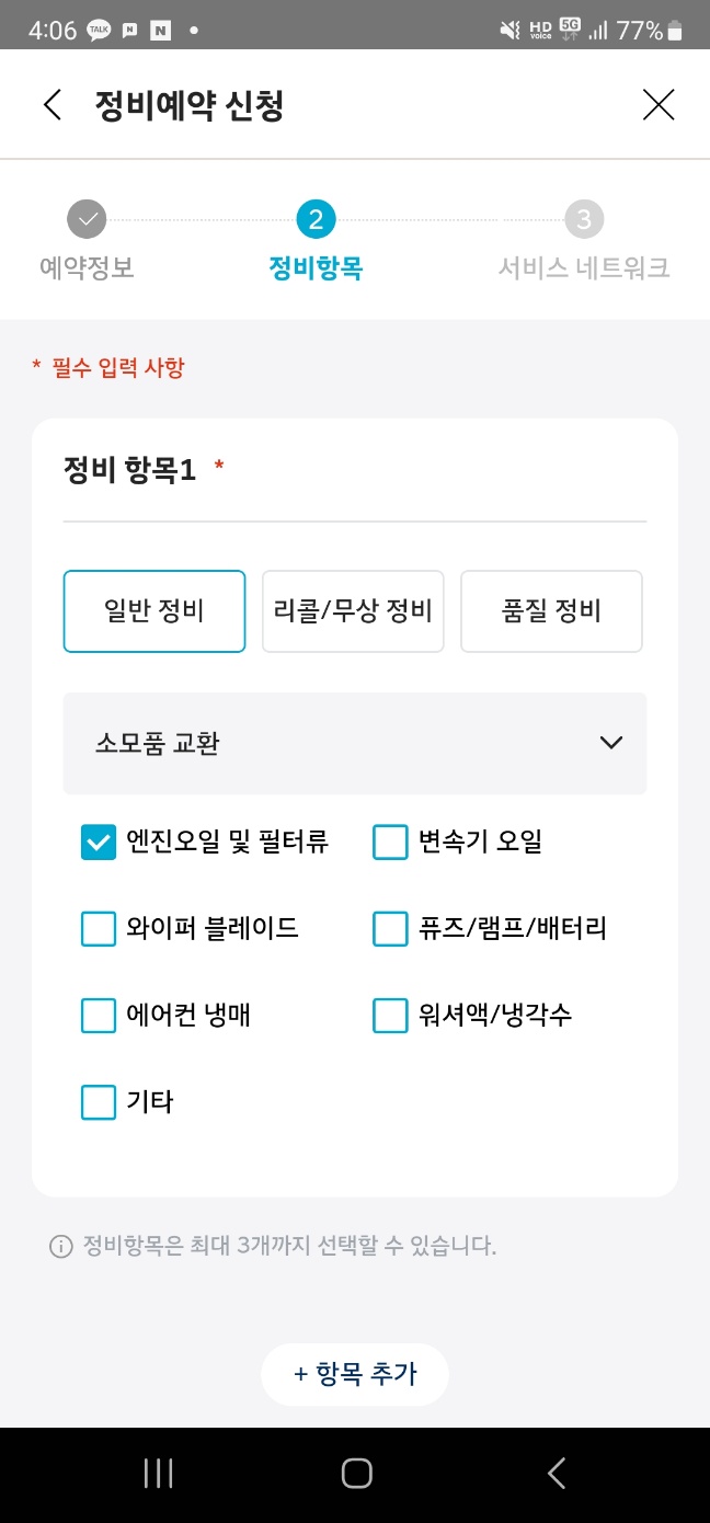 하시려는 예약품목을 입력을 해주시는데요 보통 엔진오일이나 에어컨냉매 워서약 냉각수 배터리 램프 정도가 많겠네요 와이퍼나 워셔액은 직접 사다가 하시는 분들이 많다고 합니다 그런데 와이퍼같은 경우는 현대자동차 정비쿠폰이 있으면 무료로 할 수 있다고 하니 블루핸즈에 전화해서 물어보시면 됩니다