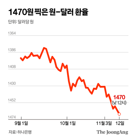 이틀 연속 장중 1470원을 넘긴 셈인데요. 이는 7개월 만에 가장 낮은 원화가치로, 지난 4월 기록했던 1487.6원에 육박하는 수준입니다.